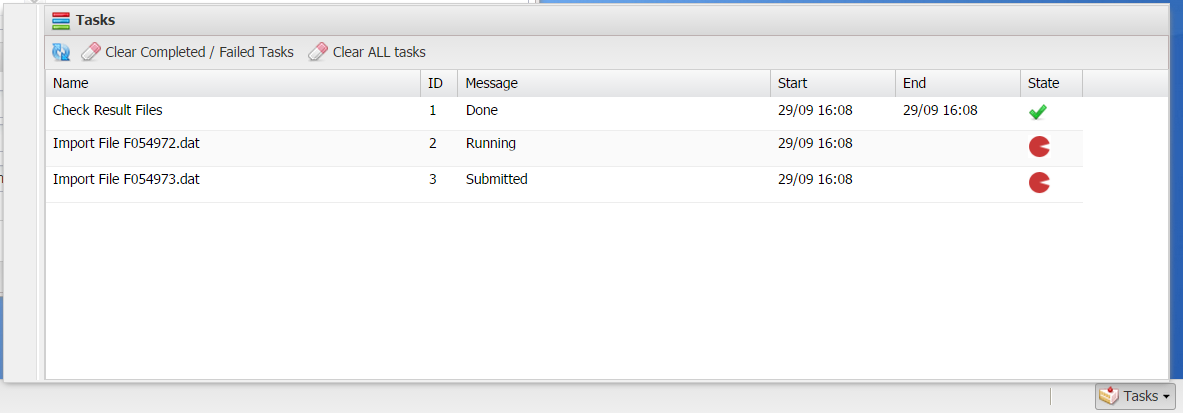 When a task is done, you are notified by a small message in the top of the screen, and you can see its status in the tasks window :
