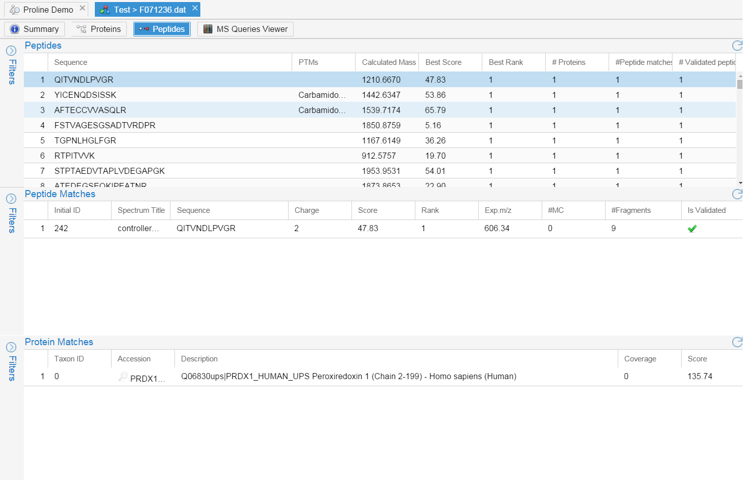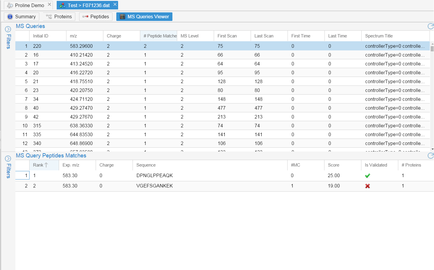 - Clicking on an MS Query will automatically load the corresponding Peptide Matches in the “MS Query Peptides Matches” table